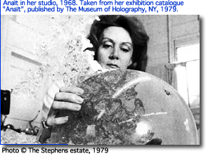 lifetime than she did. In my opinion her "Aurora" and "Water Lilies - after Monet, or Slow Death" are amongst the very best art work made using holography. These are large scale works, but the soft, sometimes child-like, "hands-on" quality of her small scale work is also uniquely hers. Her work has been misunderstood by many holographers. Anaït persisted in making dim holograms. This is for the same reason that she lit her work with floodlights instead of narrow beams. She thought that we should be more tolerant of such criteria. Similarly in her 'instant' approach to making holograms she has insisted on using a holographic set-up that has almost the immediacy of a Polaroid camera, and up until the last three years she made most of her holograms herself. In consequence she has been looked down on by those who put technical excellence high on the agenda. In her last years she gave away her equipment, and collaborated instead, carrying out some full colour pieces, which include a hand-painted flag, with Hans Bjelkhagen.