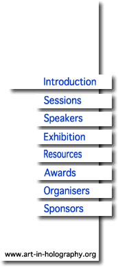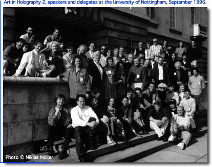 Art in Holography 2 took place at the University of Nottingham, in the heart of England, during September 1996. It provided a public platform for artists, art collectors and art writers to discuss some of the key issues relevant to creative holography. It was a review, assessment and renaissance for a medium which had clearly matured. Art in Holography2 did not spring out of the blue, it grew. It began, before anyone knew it might happen, at St. Mary's College, Indiana, six years earlier. Doug Tyler, who organised and chaired that first, experimental, meeting writes more about it on this site. The wealth of experience from that first meeting helped shape and focus the second. The speakers who were invited to Nottingham, the topics they were asked to discuss, and the events which took place during the 4-day meeting were developed by a team. This group of dedicated professionals whose opinions I respect and who were confident enough to criticise, were not simply well known names on a letterhead - but worked exceptionally hard to shape and guide the intense gathering which resulted. In thinking about how best to document Art in Holography2, we wanted something which reflected the spirit of the meeting - the professionalism of the speakers, the generosity of the delegates, and the sense of progression and maturity we experienced there. We wanted to focus on the art and the opinions, as well as the individuals who help shape the medium. What resulted are two publications: this web site (which will be updated as new material becomes available), and ink on paper, in the form of a Postcard Collection which was distributed, to art and media professionals world-wide Hopefully this collection of images and statements (digital and ink), not only gives some indication of the diversity and quality of work in the field, but the comments, from those who spoke in Nottingham, will help to define a collective 'view' of the medium at the end of the Twentieth Century. Andrew Pepper |